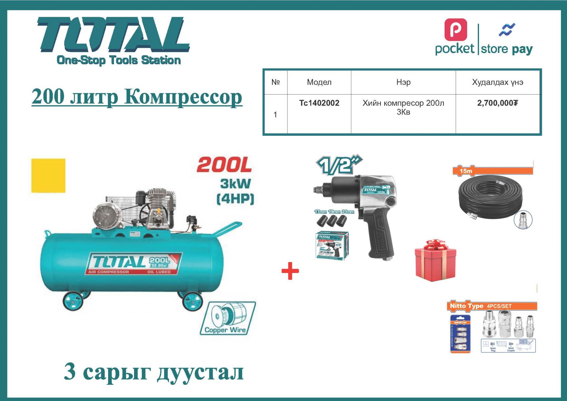 Чадал: 3.0 кВт (4 морины хүчтэй)
